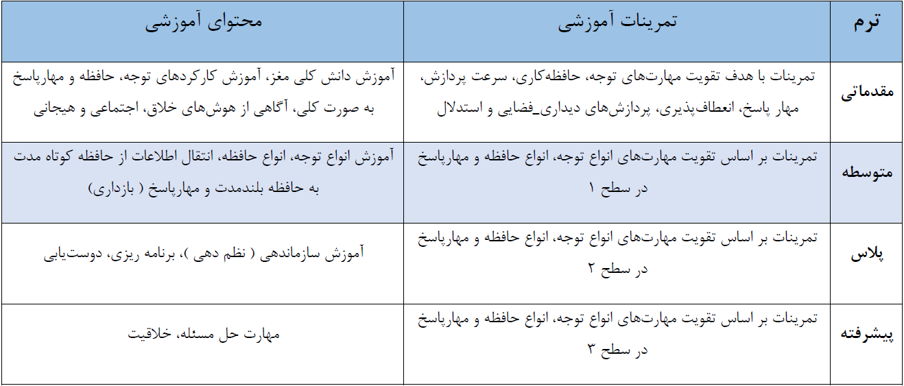 دوره باشگاه مغز نوجوانان شامل 4 ترم آموزشی در 4 سطح دشواری میباشد . هر ترم شامل 16 جلسه آنلاین به همراه تمرینات در منزل به عنوان مکمل در قالب 8 هفته آموزشی (هفته ای دو جلسه یک ساعته) می باشد.